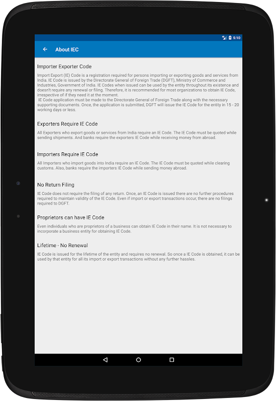 Disclaimer: This app is NOT an official app for IEC. Neither this app or AppYogi Software are related to DGFT or any government agency. The information provided here is provided based on best effort basis and AppYogi Software does not guarantee or verify the authenticity of the same. AppYogi Software or its affiliates will not be responsible for any harm, loss or damage arising out of using information provided on this application. By using this app you agree to the Terms and Conditions and Privacy policy of the company.