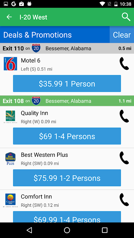iExit Search is powerful and dead simple. Search the next 100 exits for businesses (like Starbucks, Cracker Barrel, or KOA Campgrounds), amenities (like WiFi, Playground, or Truck Parking), rest stops, hotel deals, and much much more.