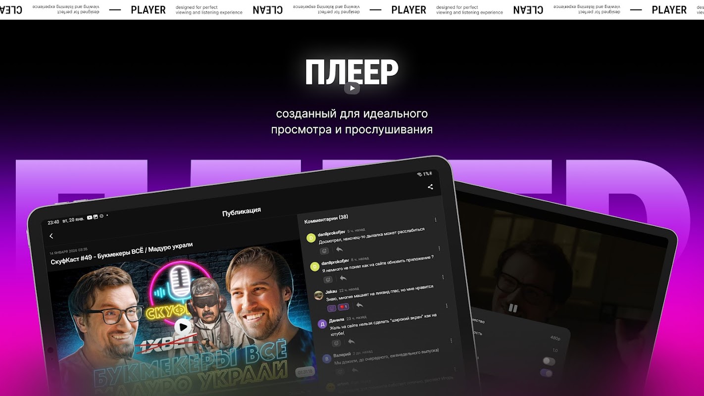 - Watching videos in the most convenient player with all standard functions (choice of quality, speed, etc.);