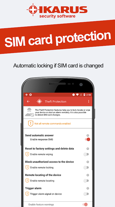 Details of the functions: https://www.ikarussecurity.com/en/private-customers/ikarus-mobile-security/