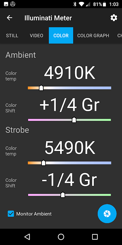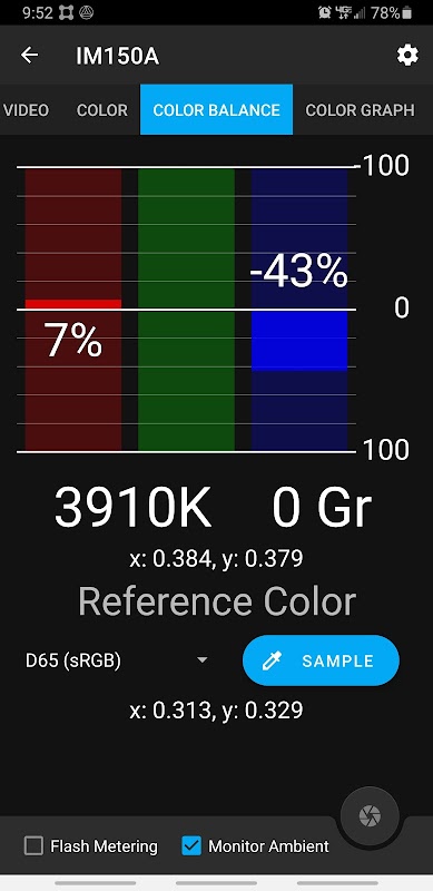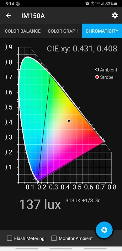 The app gets readings from the meter and displays the correct exposure, color temperature, and other light-related data on your smartphone. Use the readings from the app to enter exposure and white balance information into your mirrorless, DSLR. or digital cinema camera. The app also reports illuminance (in lux) and CIE xy chromaticity data.