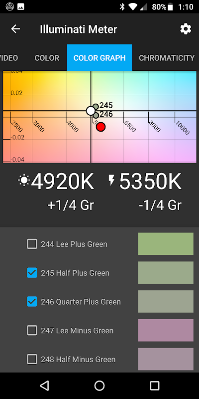 * Report COLOR TEMPERATURE in Kelvin, including green-magenta shift to help you set your camera’s white balance