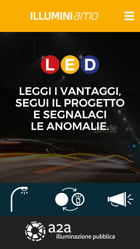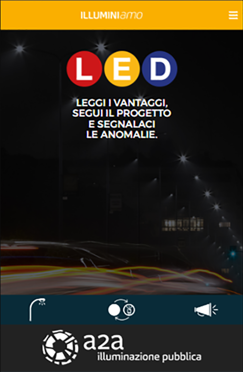 ILLUMINIAMO è l’app di A2A Illuminazione Pubblica dedicata ai cittadini di Milano, Brescia e Bergamo. Scarica l’app e potrai segnalare eventuali lampioni spenti permettendo un rapido ripristino del servizio. Potrai inoltre scoprire l’avanzamento del progetto di sostituzione di tutte le lampade dell’illuminazione pubblica con nuove sorgenti luminose a tecnologia led.