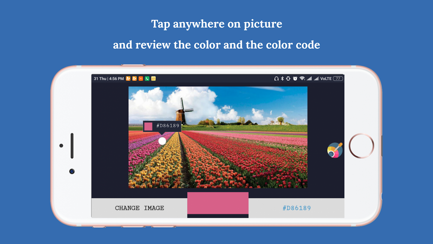 Image color identifier identifies the color and gives you the color code of all colors in a picture. Simply select from your gallery or capture your picture and tap anywhere on the picture to get the color demo and the color-code to be used. Also, explore and use among 1800 different colors available inside app color gallery. Best and light-weight color picker.