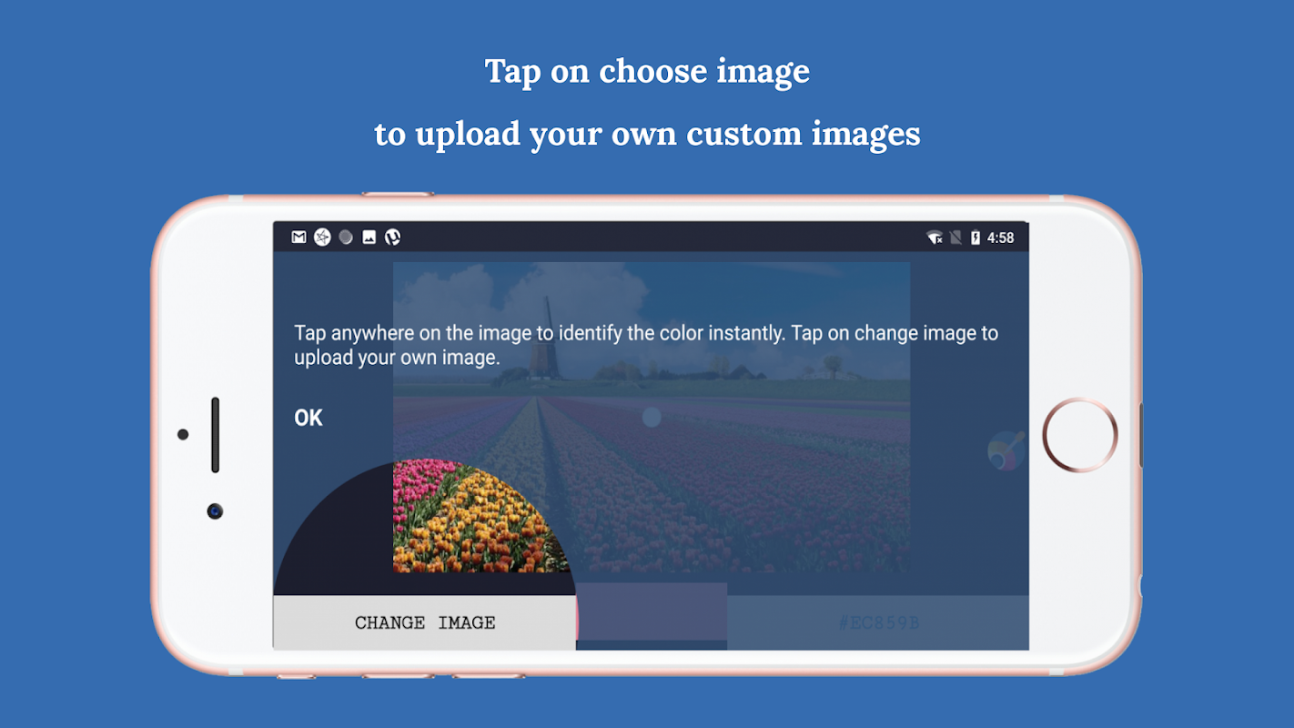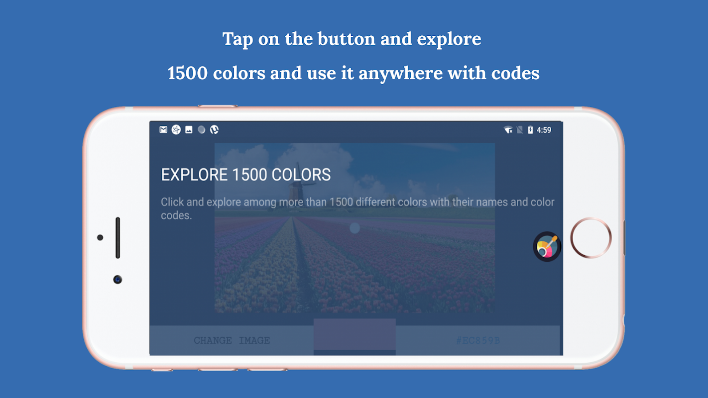 1. Get colors, their color codes, RGB's and their names by tapping anywhere on any image.