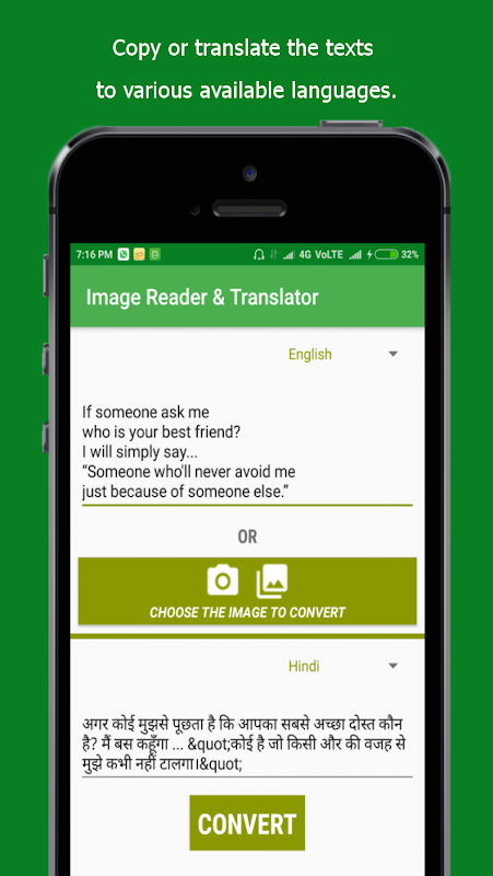 This app reads and extracts texts from the images. You can also translate the extracted text to any other languages. Easy and efficient to use.