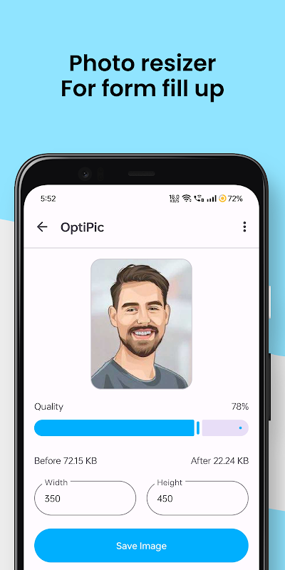 This image resizer app is designed for students, job aspirants, and professionals who need to upload digital photos or signatures for online forms. You can compress image size in KB or MB, resize signature images, and adjust width and height to meet the specific requirements of government exams, job portals, or university forms. The app supports JPG, JPEG, and PNG formats with instant results.
