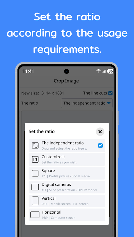 Choose custom sizes or presets like 1:1, 3:4, 9:16.
