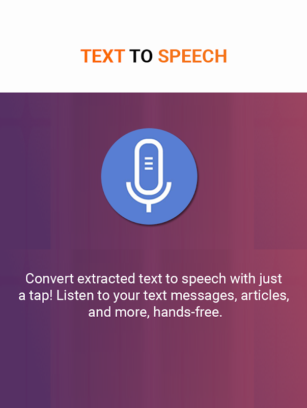 Text to Speech: Convert extracted text to speech with just a tap! Listen to your text messages, articles, and more, hands-free.