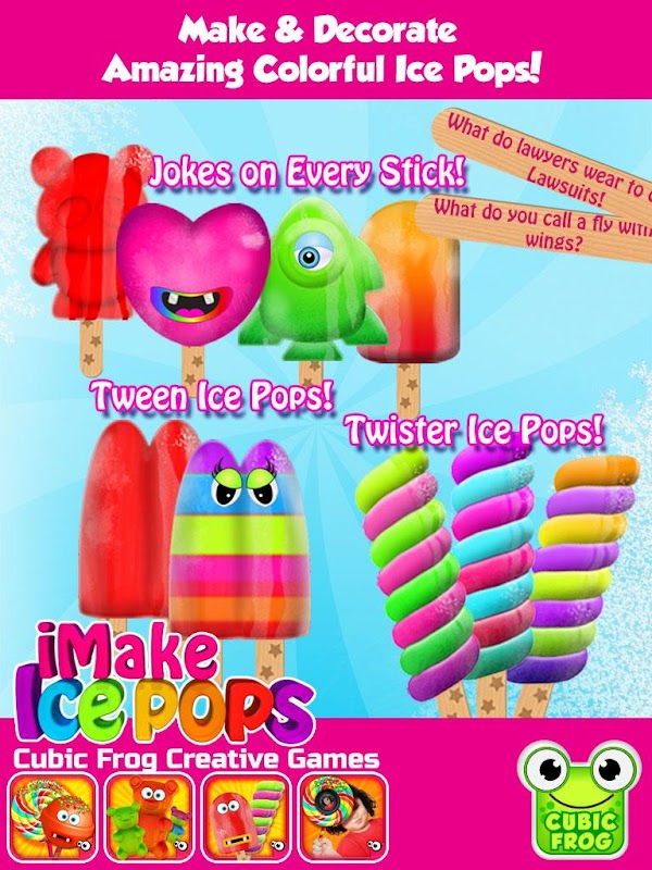 So Cool! Free iMake Ice Pops machine has sweet frozen treats, rainbow twisters, ice pops, and more! iMake Ice Pop game by Cubic Frog™ is a popsicle factory to learn to cook, design, and decorate your own colorful popsicles, fruit pops, and yummy frozen desserts in different flavors! So many rainbow colors, shapes, decorations, molds, flavors, and juices to choose from!