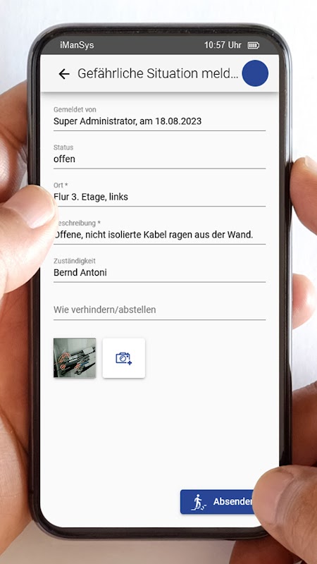 You can also use the iManSys app to report dangerous situations directly to those responsible. All you need to do is provide the location, a brief description and suggestions for avoidance. Of course you can also attach a photo. You can also report new incidents directly while on the go. Here you record, among other things: Data on the injury, time and place as well as the nature of the accident.