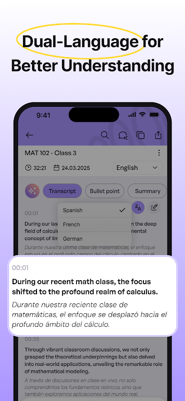 * Translation Made Easy: Translate transcripts into 120+ languages with side-by-side clarity.