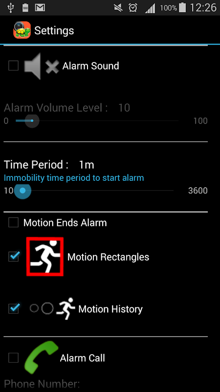2) Alarm Time Period: Immobility time period required to generate alarm.