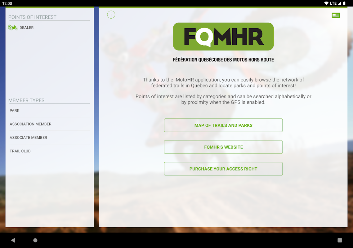 Developed by the Fédération Québécoise des Motos Hors Route, iMotoHR allows thrill-seekers to fully enjoy their favorite sport. The application brings together cartographic data such as the 12,500 km of practicable trails, the 35 parks, association members, associate members and several concessionaires. In addition to allowing you to view the trails, parks and partner dealers of the FQMHR directly on the map, the application locates you and thus allows you to orient yourself in relation to the network.
