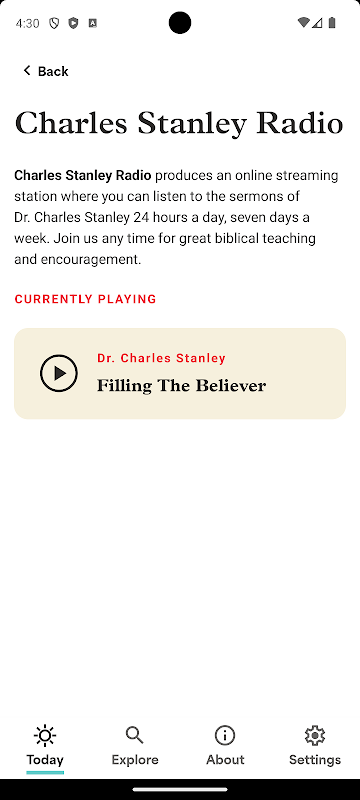 • Stream Dr. Stanley's messages 24 hours a day on Charles Stanley Radio.