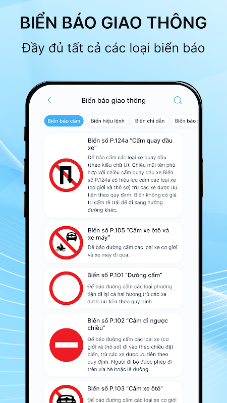 * 600 प्रश्नों में सभी यातायात संकेतों की एक सूची दिखाई देती है, जिससे उपयोगकर्ताओं को आवश्यकता पड़ने पर संकेतों का ज्ञान प्राप्त करने में मदद मिलती है।