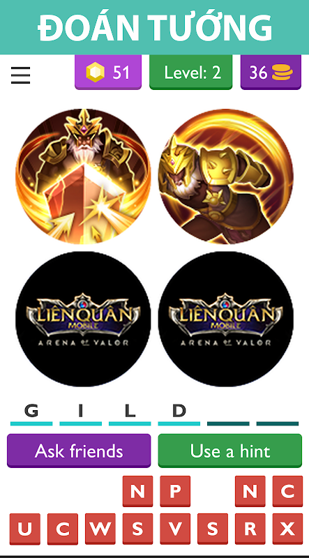 * Đoán tướng qua 2 trong số 4 icon skill, tap chọn kí tự phù hợp.