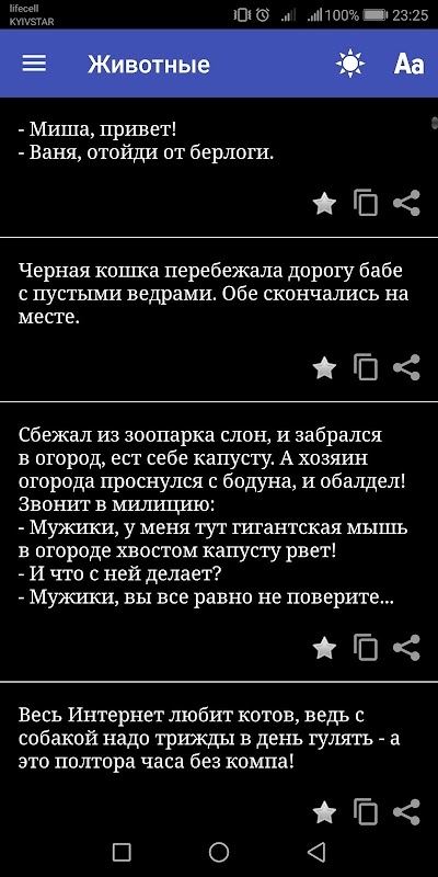 Приложение поддерживает ночной режим и оффлайн режим (без интернета), есть поиск. Понравившиеся анекдоты можно добавить в избранное.
