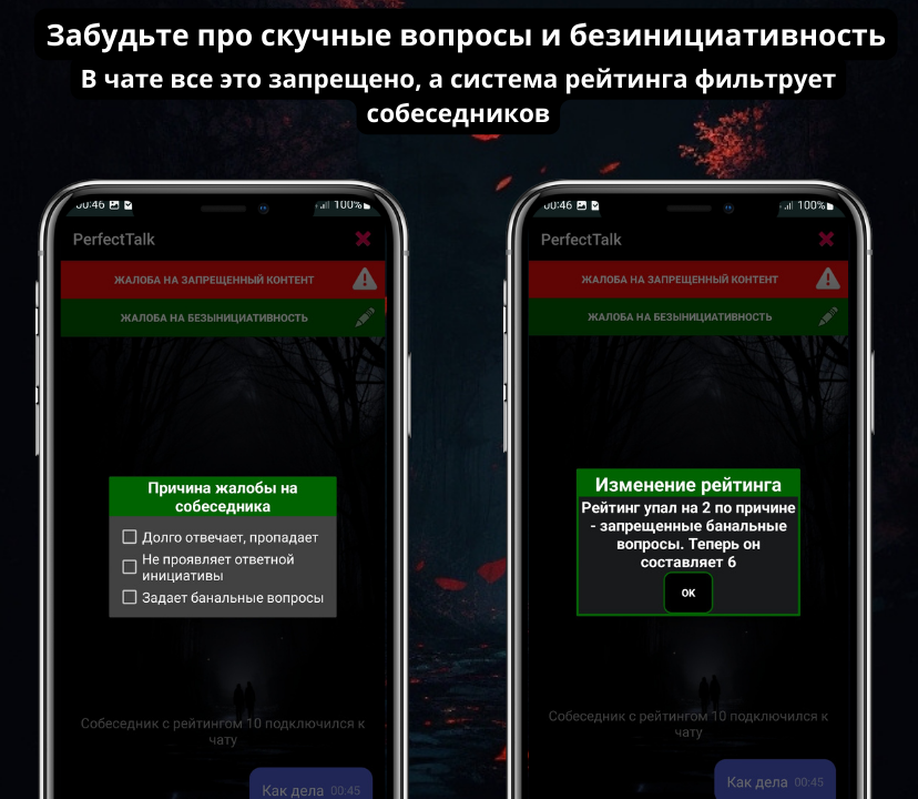 विशिष्ट "आप कैसे हैं?" और आप क्या कर रहे हैं?" अनाम चैट में? हमने एक एप्लिकेशन बनाया है जहां यह प्रतिबंधित है! PerfectTalk उपयोगकर्ता रेटिंग सिस्टम पर आधारित एक अद्वितीय अनाम चैट ऐप है।