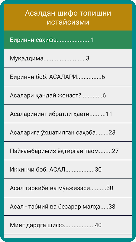 Мазкур “Асалдан шифо топишни истайсизми?” де- ган китобимиз орқали ўқувчиларга асалари ва асал- нинг шифолиги тўғрисида батафсил ва кенгроқ маъ- лумотлар бериб, инсон соғлигини тиклаш ва ундан муолажа сифатида асқотадиган муолажа турларига ҳам алоҳида эътибор қаратдик. Тўғри, айрим фи- кр-мулоҳаза ва маслаҳатларни асалари ҳаёти ва асал ҳақидаги бошқа китобларда ҳам учратиш мумкиндир. Лекин асалнинг шифолик хусусиятларини таклиф ва маслаҳатларни беришда кўпроқ ҳаётий тажрибамиз- дан келиб чиққан ҳолда иш тутдик. Бу эса беморлар асалдан фойдаланишда ноқулайликларни келтириб чиқармайди, деган умиддамиз. Мазкур китобда бе- рилган маълумотлар билан кифояланиб қолмоқчи эмасмиз. Келгусида яна турли манба ва тадқиқотларга