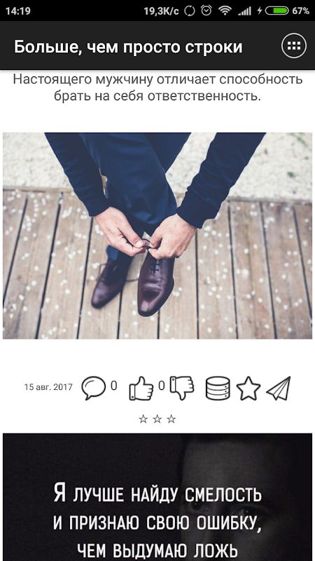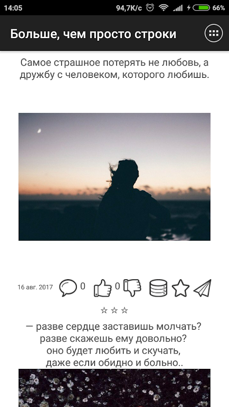 Понравившиеся записи можно комментировать и оценивать. Все понравившиеся картинки можно сохранять в галерее устройства в папке приложения. Ты можешь делиться записями с друзьями через социальные сети, а так же другие установленные на устройстве приложения. Ну и конечно, ты можешь оставлять лайки и сохранять записи в избранное.