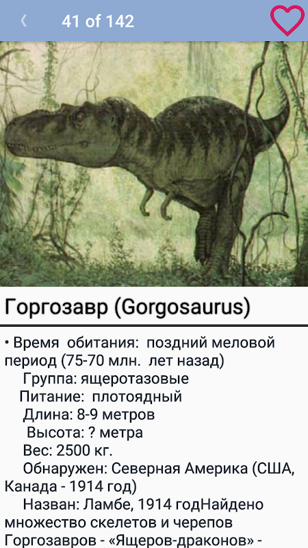 हमारे ग्रह पर रहने वाले या जीवित जानवरों की कोई भी प्रजाति डायनासोर जैसी रुचि को उजागर नहीं करती है। आवेदन "डायनासोर के प्रकार" में आपको कई प्रकार के डायनासोर मिलेंगे। डायनासोर एनसाइक्लोपीडिया ऐप में दो खंड होते हैं, एक खंड में सभी डायनासोर होते हैं, और दूसरा केवल आपकी पसंदीदा डायनासोर प्रजातियां होती हैं।