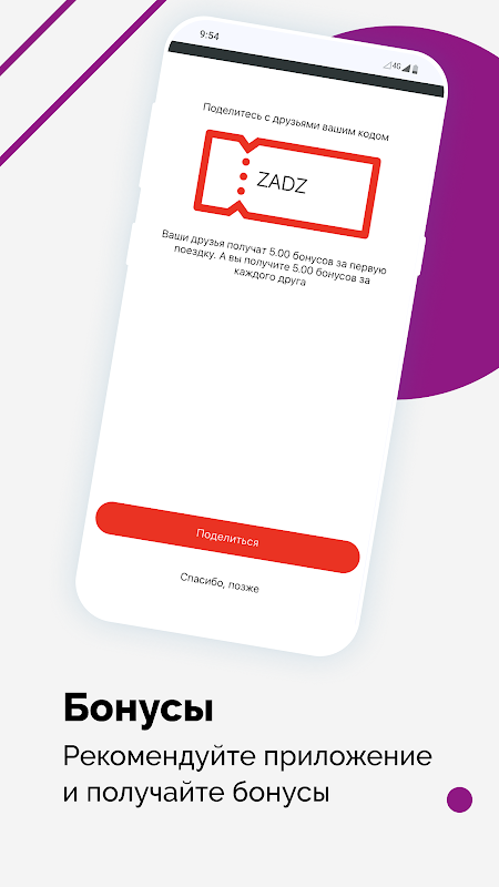 अपने रेफरल कोड को अपने दोस्तों के साथ या सोशल नेटवर्क के माध्यम से साझा करें और बोनस पाएं! उन्हें अपनी सवारी के लिए भुगतान करने के लिए उपयोग करें।