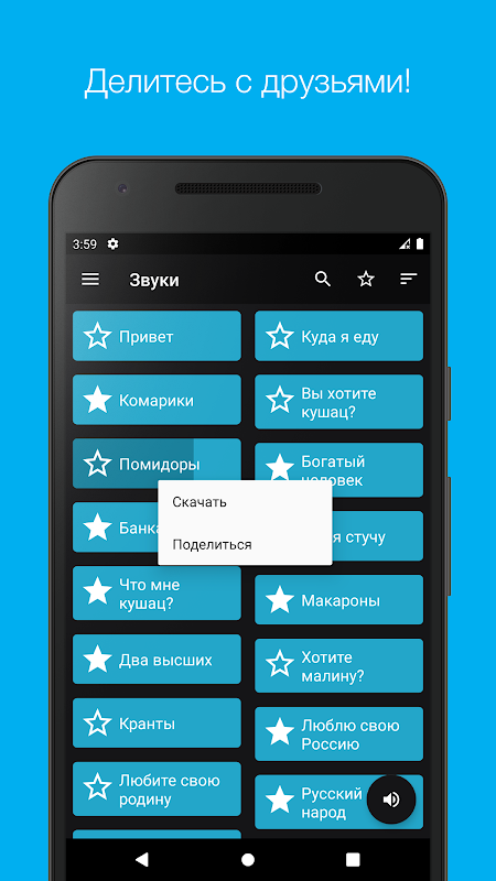 हमारे आवेदन में आपको 150 से अधिक वाक्यांश मिलेंगे! अपने पसंदीदा ध्वनियों को अपने पसंदीदा में जोड़ें, डाउनलोड करें और उन्हें चलाने के लिए अपने दोस्तों के साथ साझा करें