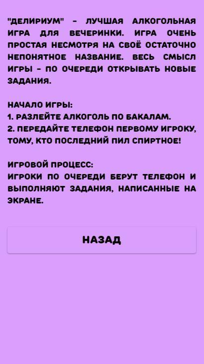 डेलीरियम युवा शराबियों के लिए बिल्कुल भी खेल नहीं है। कोला की बोतल या चाय की केतली पीकर आप ठीक वैसा ही कर सकते हैं। अंत में, शराब को केवल आराम करने की आवश्यकता होती है, और डेलिरियम पूरी तरह से सभी प्रतिभागियों को आराम देता है और बिना किसी डिग्री के, आपको मज़ेदार, अप्रत्याशित और खुलासा कार्यों का आनंद लेने का अवसर देता है।