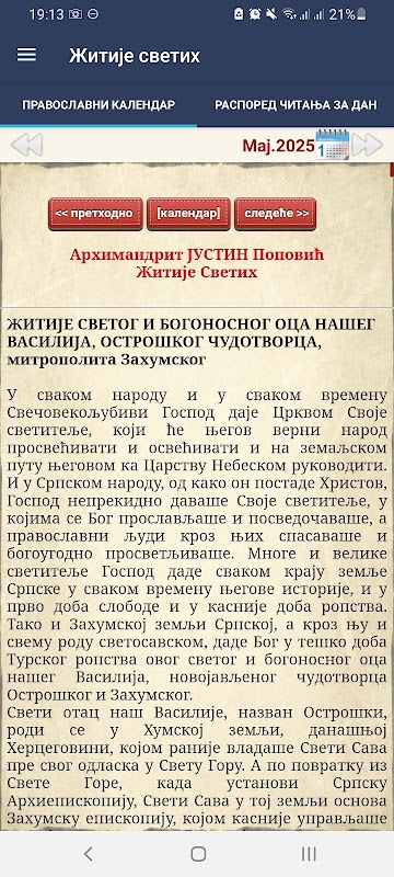 - कार्यक्रम में रेवरेंड एवा जस्टिन पोपोविक द्वारा संतों के जीवन शामिल हैं। संतों के जीवन में उनके जीवन, कार्यों और चमत्कारों का वर्णन किया गया है।