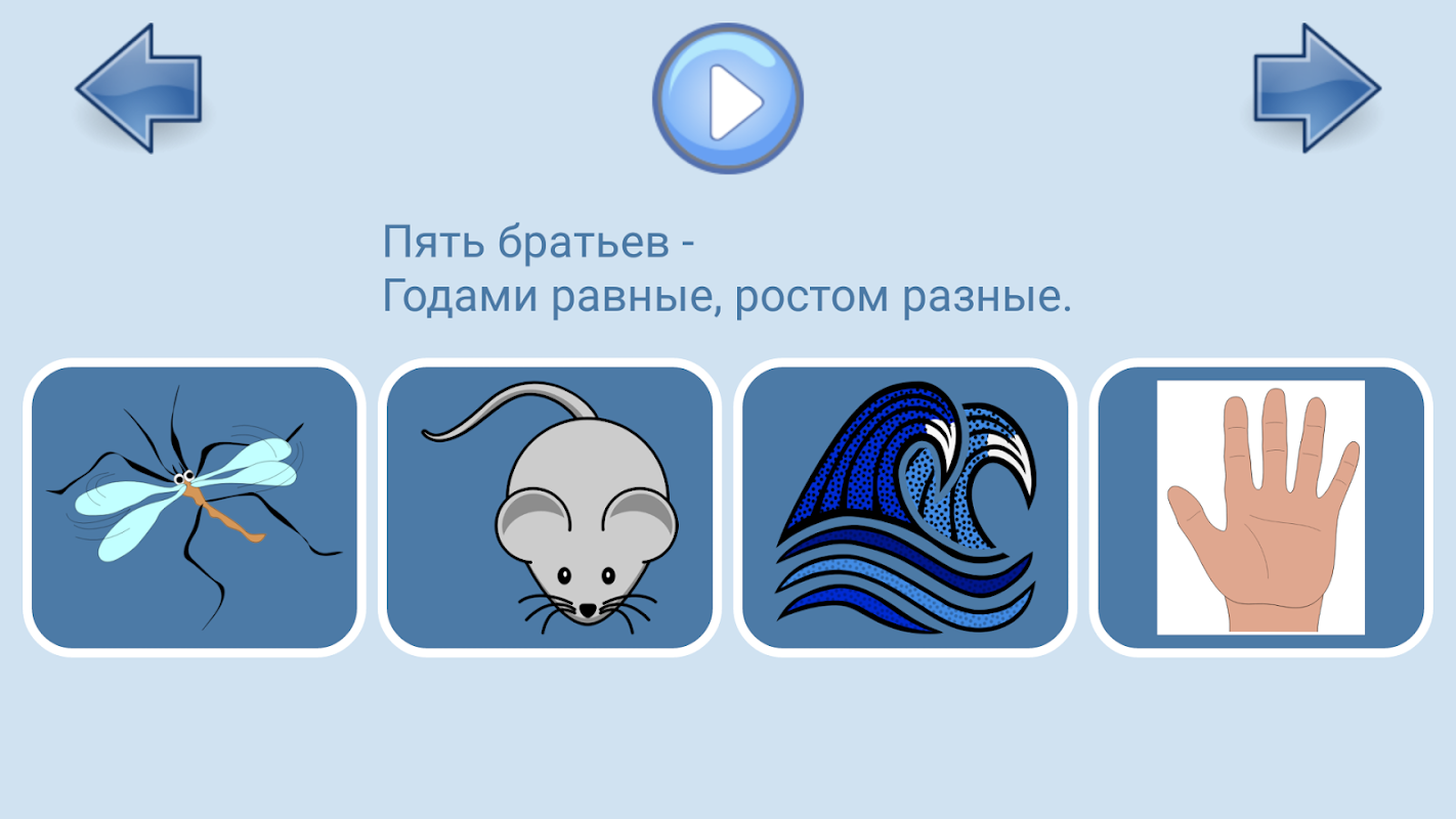 Текст загадок озвучивается, а варианты ответов представлены в виде картинок, что позволяет ребенку заниматься самостоятельно.