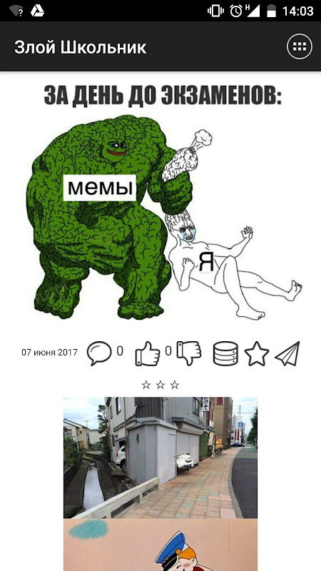Позитивное приложение для тебя и твоих одноклассников! Проводи время весело в компании с отборными мемасами. Самые смешные картинки с приколами, ежедневное обновление. Прикольные анекдоты и смешные фотографии. Угарно, смотреть до конца, ржачные мемы, баяны из интернета, приколы с животными и котами, ржака и оборжаша, лолы и фотоприколы, фото с приколами, самые смешные картинки и мемчики. Позитив на каждый день! Комментируй мемасы и будь первым кто увидел прикол!