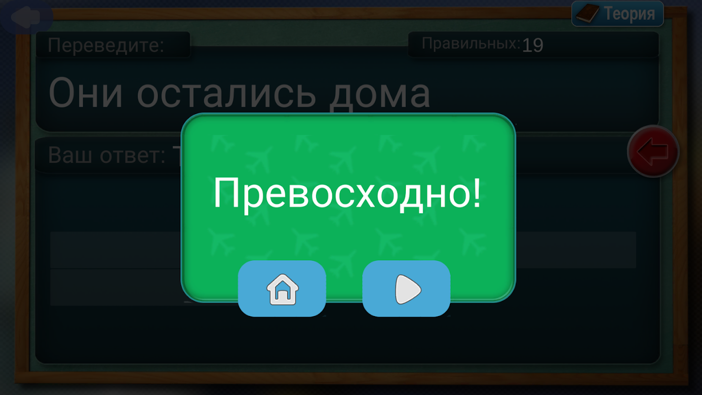Программа предоставляет теорию составления предложений английского языка простым и доступным языком. В любое время вы можете подсмотреть и выучить то, что забыли, чтобы продолжить изучение.