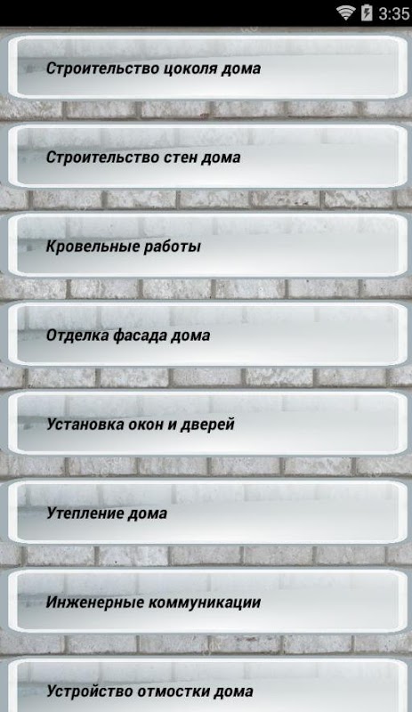 एक परिचयात्मक आवेदन कैसे खरोंच से घर बनाने के लिए - एक साइट चुनने और परमिट प्राप्त करने से लेकर परिष्करण कार्य तक। विस्तृत विवरण; मुखौटा परिष्करण और प्राथमिक आंतरिक कार्य; मिट्टी का काम, नींव; घर के तहखाने का निर्माण; घर की दीवारों का निर्माण; छत, खिड़कियों और दरवाजों की स्थापना, आदि .. यह एक परिचयात्मक अनुप्रयोग है इसलिए अनुभागों की संख्या सीमित है।