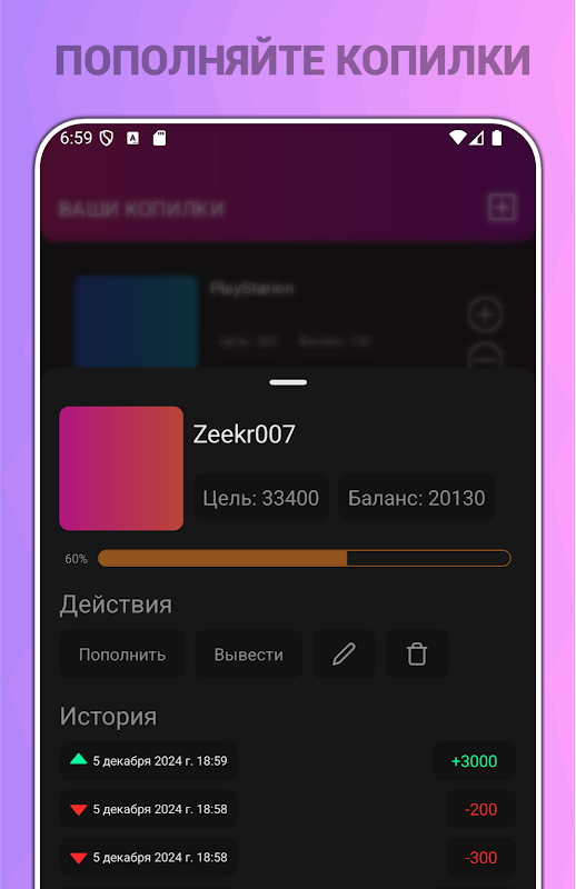 कमांडर गुल्लक आपके सपने की राह पर आपका वफादार सहायक है! गुल्लक की मदद से, मैं अपने लिए एक सुविधाजनक बचत प्रणाली बनाकर, दिन-ब-दिन पैसे बचाऊंगा। मैं अपने सपने के लिए पैसे बचाता हूं और बच्चों का गुल्लक या गुल्लक इस प्रक्रिया को एक मजेदार खेल में बदल देता है। मैं एक सपने के लिए बचत करता हूं, और गुल्लक में डाला गया हर सिक्का मुझे उसके करीब लाता है। कमांडर गुल्लक जैसे वफादार साथी के साथ अपने सपनों के लिए बचत करना बहुत आसान हो गया है!
