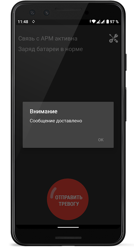 अलार्म संचारित करने के लिए, आपको एप्लिकेशन में बड़े लाल बटन को दबाना होगा। यदि अलार्म सफलतापूर्वक प्रसारित होता है, तो संदेश "संदेश दिया गया" प्रदर्शित होता है।