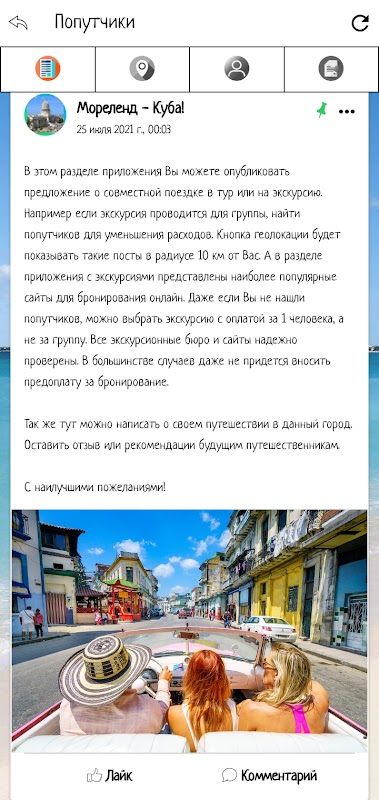 ऐसे समय होते हैं जब आप अकेले या एक जोड़े के रूप में यात्रा कर रहे होते हैं, और आप क्यूबा में एक दिलचस्प भ्रमण पर जाना चाहते हैं, लेकिन यह महंगा है, क्योंकि गाइड एक समूह शुल्क लेता है। इस एप्लिकेशन में, आप साथी यात्रियों को संयुक्त भ्रमण के लिए ढूंढ सकते हैं, और दौरे की लागत को कम कर सकते हैं। एप्लिकेशन के "साथी यात्री" अनुभाग में, अपनी पोस्ट प्रकाशित करें और यह 10 किलोमीटर के दायरे में एप्लिकेशन के अन्य उपयोगकर्ताओं के लिए दृश्यमान होगी। और जब आप "जियोलोकेशन" आइकन पर क्लिक करते हैं, तो आप स्वयं से 10 किलोमीटर के दायरे में ऐसे अन्य ऑफ़र देख सकते हैं! इसके अतिरिक्त, आवेदन में, आप क्यूबा के शहरों के साथ एक प्रारंभिक परिचित बना सकते हैं, दर्शनीय स्थलों और वीडियो समीक्षाओं को देखकर यात्रा करने के लिए जगह चुन सकते हैं। एप्लिकेशन में टूर एजेंसियों, ट्रैवल एजेंसियों और चयनित शहर में अपनी सेवाओं की पेशकश करने वाले होटलों के बारे में भी जानकारी है।