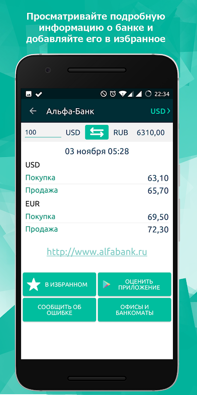 Отличное приложение для поиска выгодного обмена валюты(доллара и евро) и отслеживания актуальных курсов валют с историей их изменения.