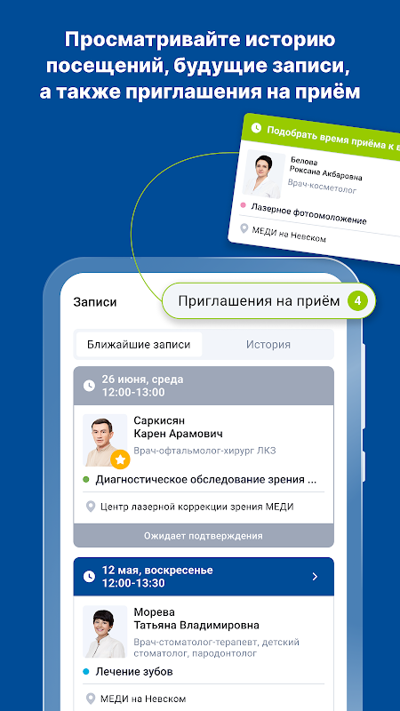 – मेडी क्लिनिक में डॉक्टरों के साथ अपॉइंटमेंट के निमंत्रण देख सकते हैं;