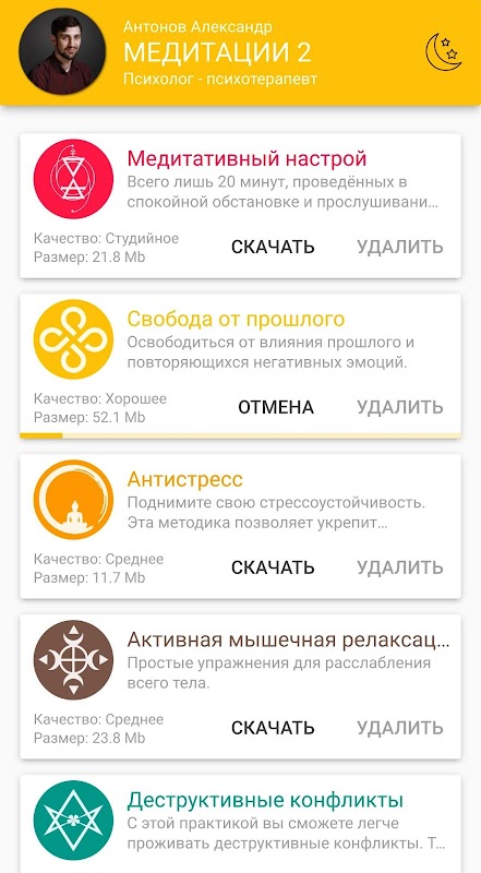 मनोवैज्ञानिक-मनोचिकित्सक अलेक्जेंडर एंटोनोव के ध्यान कार्यक्रम का दूसरा अंक। नई रिकॉर्डिंग आपके लिए चार तकनीकें खोलेगी: मूड में सुधार, शक्ति का स्थान, आत्म-प्रेम और गहरा विश्राम। वे डिफ़ॉल्ट रूप से सेट हैं.
