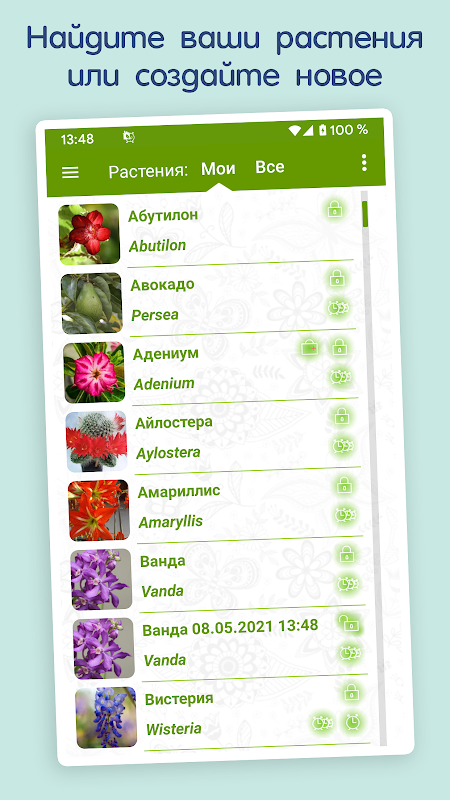 इनडोर प्लांट मैनेजर आपको पौधों की देखभाल (पानी देना, छिड़काव, खाद डालना, छंटाई, रोपाई, बीमारियों का इलाज) को व्यवस्थित करने में मदद करेगा और आपको एक निश्चित समय पर याद दिलाएगा। देखभाल और उपचार का विस्तृत विवरण है। वर्तमान में, आवेदन में 501 पौधे शामिल हैं।
