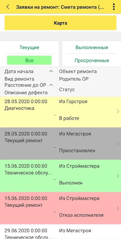 • अनुप्रयोगों की सूची की रंग कोडिंग - आपको एप्लिकेशन की स्थिति (दोष की गंभीरता, मरम्मत की स्थिति, उपकरण की गंभीरता या मरम्मत के प्रकार) को तुरंत निर्धारित करने की अनुमति देती है। उदाहरण के लिए, मरम्मत अनुरोधों को उनकी स्थिति के आधार पर अलग-अलग रंगों से चिह्नित किया जा सकता है: "पंजीकृत", "प्रगति में", "निलंबित", "पूर्ण", आदि।