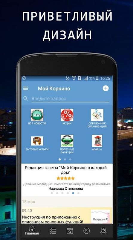 «Мой Коркино» - долгожданное городское мобильное приложение, которое дает доступ ко всей информации о нашем родном городе: новостям, афише и справочнику организаций.