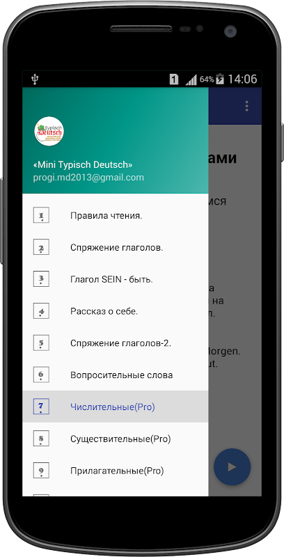 आवेदन ऑडियो पाठों के प्रारूप में शुरुआती लोगों के लिए जर्मन भाषा का अध्ययन करने के लेखक की विधि पर आधारित है।