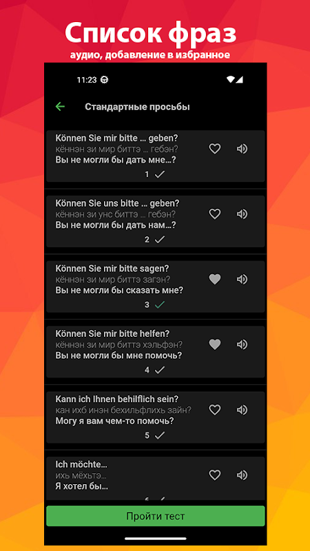 सुविधा के लिए, रूसी-जर्मन ऑफ़लाइन वाक्यांशपुस्तिका को श्रेणियों में विभाजित किया गया है: अभिवादन, आभार, विनम्रता सूत्र, यात्रा, रेस्तरां, भोजन, उत्पाद, रवैया, आदि।