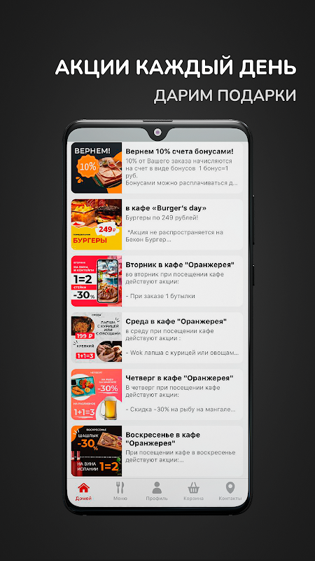 एप्लिकेशन के माध्यम से अपने पसंदीदा व्यंजन ऑर्डर करें और हम 45 मिनट या एक निश्चित समय से लाएंगे। मेनू में आपको स्वादिष्ट रोल, बर्गर, कबाब, ऐपेटाइज़र और सलाद, शावरमा, वोक और पास्ता मिलेगा। फैमिली डिनर या दोस्तों के साथ मीटिंग की योजना बना सकते हैं। आपके पास जन्मदिन या उत्सव की घटना है - हम सब कुछ का ख्याल रखेंगे, एक निश्चित समय तक ऑर्डर करें और उत्सव की मेज पूरी तरह से ढकी हुई है, आपको बस कोई व्यंजन लेना है और मेहमानों से मिलना है। यदि आपका जन्मदिन है, तो हम आपको कैफे में जाने पर आपके ऑर्डर पर 15% की छूट और उपहार के रूप में 300 बोनस देते हैं। और बोनस भी जमा करें और उनके साथ एक कैफे में या आवेदन के माध्यम से ऑर्डर करते समय भुगतान करें। अगर आप खुद लेते हैं