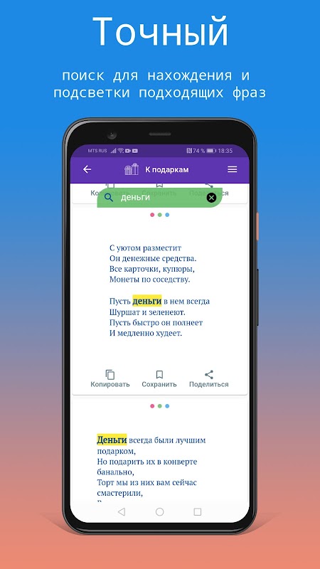 अब आपको बधाई में महत्वपूर्ण शब्दों को खोजने के लिए कविता और गद्य के किलोमीटर के माध्यम से फ्लिप करने की आवश्यकता नहीं है, जैसा कि आपने अन्य अनुप्रयोगों में किया था।