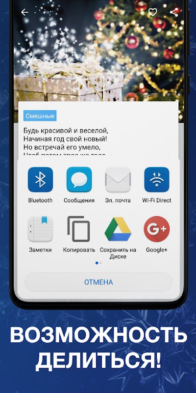 लेकिन हमारी सेवा सिर्फ नए साल की शुभकामनाओं तक ही सीमित नहीं है. हम क्रिसमस की शुभकामनाओं का एक विशाल चयन भी पेश करते हैं। आख़िरकार, क्रिसमस साल का एक विशेष समय है जब हम एक-दूसरे के करीब आते हैं, और हर शब्द, हर बधाई का एक विशेष मूल्य होता है। हमारे एप्लिकेशन की मदद से अपने प्रियजनों और दोस्तों को वास्तविक आनंद और गर्मजोशी दें।