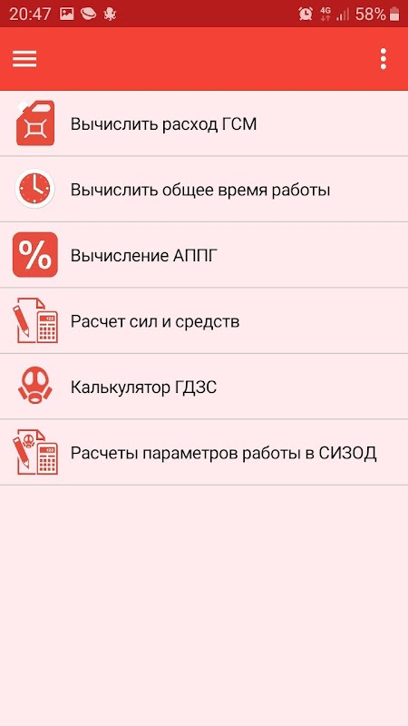 "सहायक गार्ड चीफ" एप्लिकेशन में आग बुझाने वाले पर्यवेक्षक के लिए आवश्यक जानकारी शामिल है। परिशिष्ट में अग्निशमन उपकरण, आग बुझाने वाले एजेंट, एपीपीजी, जीडीजेडएस की गणना के लिए एक कैलकुलेटर, आग पर परिचालन समय और ईंधन और स्नेहक की गणना के लिए विशेषताओं और पैरामीटर शामिल हैं।