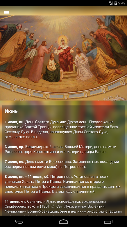 В этом приложении, сделанном с Божьей помощью мы по крупицам собираем все самое чистое и светлое. Нам дана возможность рассказать о жизни Русской Православной Церкви, обычаях, новостях, календаре. Мы постоянно добавляем как можно больше информации, необходимой верующему человеку.